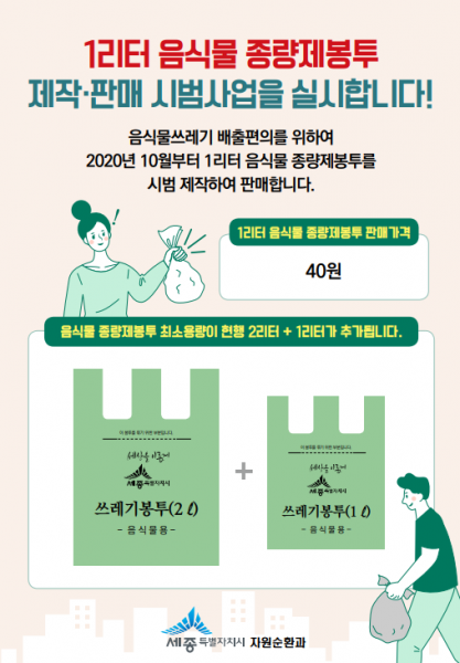 [무한뉴스] 세종특별자치시가 1인 가구의 증가에 따른 음식물폐기물 소량 발생 추세를 반영해 오는 10월부터 음식물종량제봉투 1ℓ를 제작·보급한다.