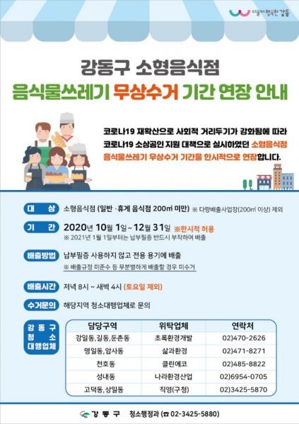 [무한뉴스] 강동구가 소형음식점 음식물쓰레기 무상 수거 기간을 당초 이달 말에서 오는 12월 31일까지로 3개월 더 연장한다.