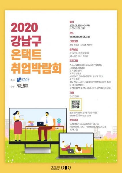 구인기업·구직자들의 참가신청은 22일까지 ‘강남구 온택트 취업박람회’ 홈페이지 에서 할 수 있으며 자세한 사항은 일자리지원센터 또는 큐리아서티 프로젝트로 문의하면 된다.