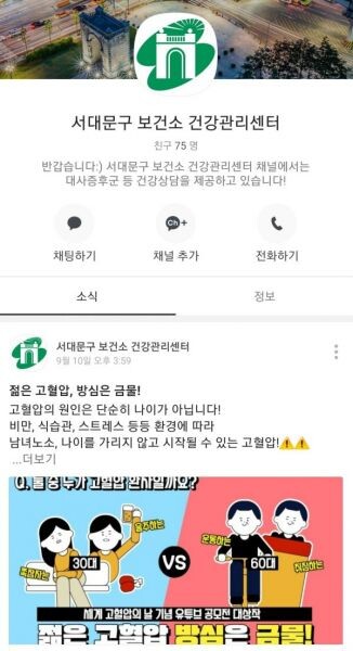 [무한뉴스] 서대문구는 카카오톡에 ‘서대문구보건소 건강관리센터’ 채널을 개설해 온라인으로 만성질환과 건강, 운동, 영양 상담 서비스를 제공한다고 17일 밝혔다.