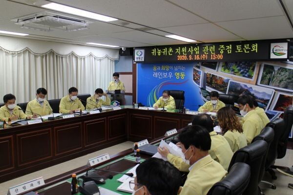군은 16일 상황실에서 박세복 군수 주제로 각 부서장들이 참석한 가운데 도시민 유치 활성화와 귀농귀촌인의 안정적인 영농정착 지원을 위한 ‘귀농귀촌 지원사업 관련 중점 토론회’를 개최했다.