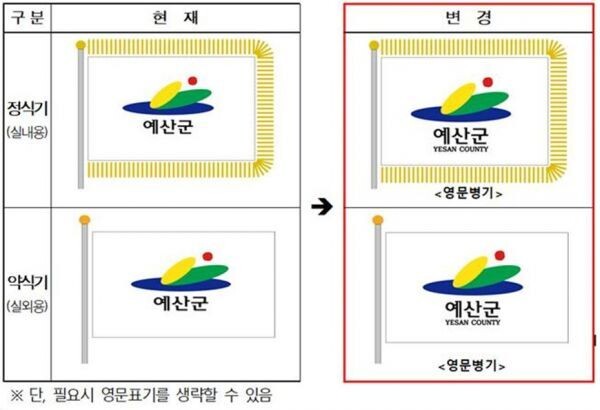 현재의 군기는 ‘예산군 이미지 표준화 규정집’에 근거해 군 상징표식 아래에 한글로 ‘예산군’이 기재돼 있으며 군은 글로벌 시대에 대응하고 대외 이미지 제고를 위해 한글과 영문자를 병행 표기하는 도안으로 군기 변경을 추진한다.