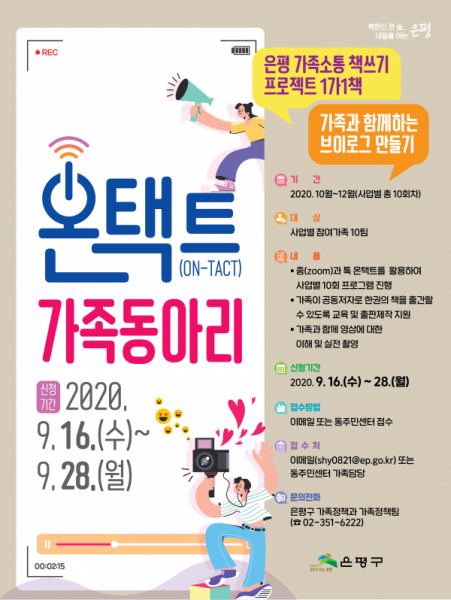 2020년 온택트 가족동아리 사업은 ‘은평 가족소통 책쓰기 프로젝트 1가1책’프로그램과 ‘가족과 함께하는 브이로그 만들기’ 등 두가지 프로그램으로 나뉜다.