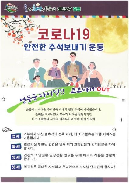 [무한뉴스] 충북 영동군이 민족 최대 명절인 추석을 앞두고 코로나19 예방을 위한 ‘코로나19 안전한 추석보내기 4대 수칙’을 발표했다.