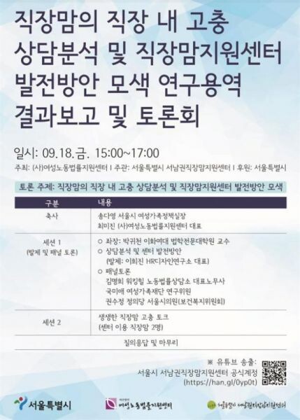 직장맘 노동 현실 파악 및 노동권 보장을 위한‘직장맘의 직장 내 고충 상담분석 및 직장맘지원센터 발전방안 모색 연구용역 결과보고 및 토론회’를 9월 18일 오후 3시, 랜선으로 개최한다.