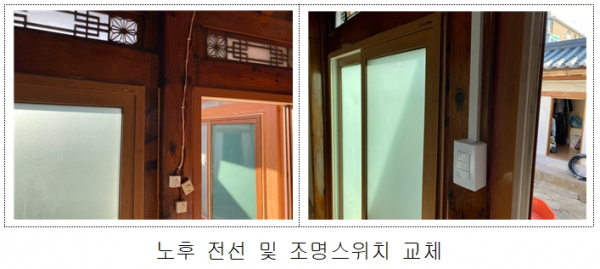 한옥 노후 전기배선 교체사업은 2018년 한옥밀집지역 내 등록한옥을 대상으로 시범 시행했으며 2019년부터 서울시 전체로 지역범위를 확대해 세대분전반·차단기·노후 전선 교체 및 스위치·콘센트·조명기구 개선 등 지금까지 총 32동의 등록한옥에 대해 지원했다.