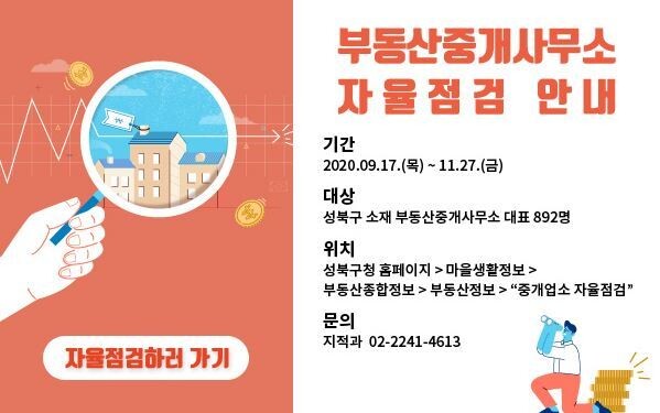 [무한뉴스] 서울시 성북구가 부동산중개무소의 불법행위 근절 및 법령 개정사항 등의 재확인을 위한 지도·점검을 위해 2020년09.17.부터 ‘인터넷 자율점검’을 실시한다.
