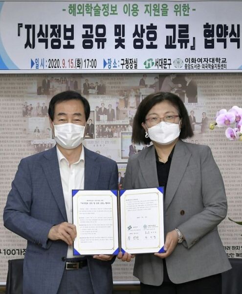 [무한뉴스] 서대문구는 이화여자대학교 중앙도서관·외국학술지지원센터와 최근 ‘해외 학술정보 이용 지원을 위한 지식정보 공유 및 상호 교류’ 협약을 맺었다고 18일 밝혔다.