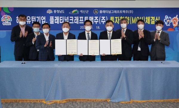MOU에 따르면, 플래티넘크래프트맥주는 중국 산둥성 연태에 위치한 수제맥주 공장을 청산하고 예산신소재일반산업단지 내 1만 6500㎡의 부지에 새롭게 생산시설을 건립한다.