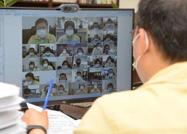 [무한뉴스] 중구가 21일 코로나19 대응현황 및 현안업무를 공유하는 확대간부회의를 '온나라 이음 PC영상회의 시스템'을 활용한 비대면 영상회의로 대체했다.