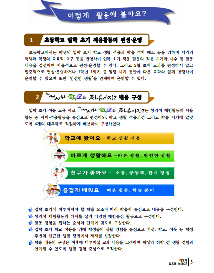 세 번째 주제는 자신의 감정을 표현하고 도움을 요청하는 등 관계 형성과 관련 있는 ‘친구가 좋아요.’며 네 번째는 색종이로 찢어서 자음 만들기, 몸으로 숫자 표현하기 등 배움활동, 학습 준비와 관련 있는 ‘즐겁게 배워요.’ 단원으로 체계를 구성했다.