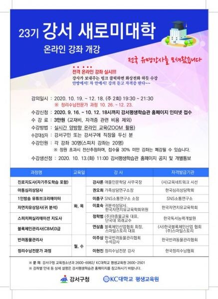 [무한뉴스] 서울 강서구는 공간의 제약을 받지 않고 강의를 수강해 전문 자격증을 취득할 수 있도록 ‘23기 강서 새로미대학 온라인 강좌’를 개설한다고 밝혔다.