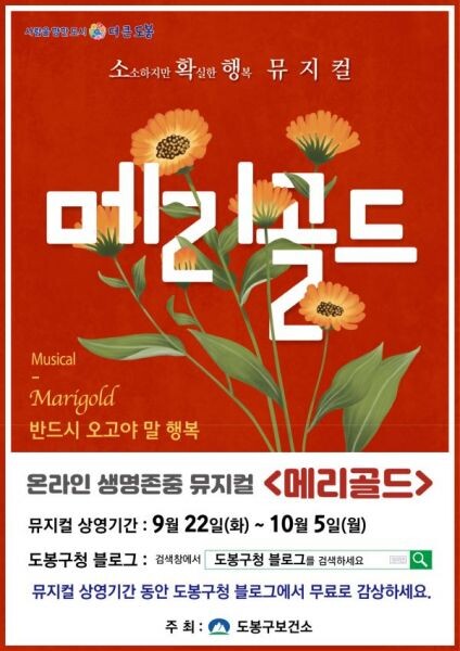 [무한뉴스] 도봉구는 9월 22일부터 오는 10월 5일까지 14일간 코로나19로 지친 구민들의 코로나블루 해소를 위해 생명존중 뮤지컬 ‘메리골드’를 온라인 상영한다.