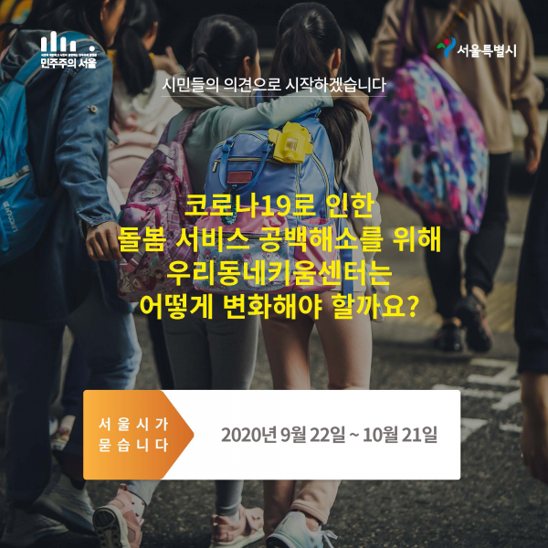 [무한뉴스] 서울시가 “코로나19로 인한 돌봄 서비스 공백 해소를 위해 ‘우리동네키움센터’는 어떻게 변화해야 할까요?”를 주제로 온라인 의견수렴을 실시한다.