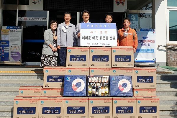 [무한뉴스] 현대트랜시스가 지난 22일 추석 명절을 맞아 주변 어려운 이웃과 나누고 싶다며 선물세트 184개를 성연면행정복지센터에 전달했다.
