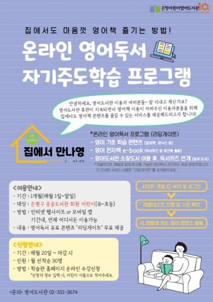 [무한뉴스] 은평구와 은평어린이영어도서관은 코로나19로 도서관 휴관이 장기화됨에 따라 주민들이 집에서도 영어독서활동을 할 수 있도록 10월부터 12월 말까지 ‘온라인 영어독서 자기주도학습 프로그램’을 도입해 운영한다.