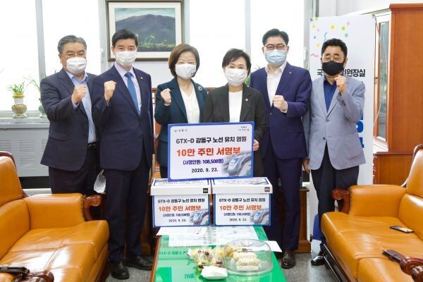 [무한뉴스] 강동구가 23일 오후 국회 국토교통위원장실에서 진행된 국토교통부장관 면담에서 수도권광역급행철도 네 번째 노선인 GTX-D 유치를 염원하는 10만 주민 서명부를 전달하고 수도권 서부에서 강동구를 잇는 GTX-D 신설을 강력히 건의했다고 밝혔다.