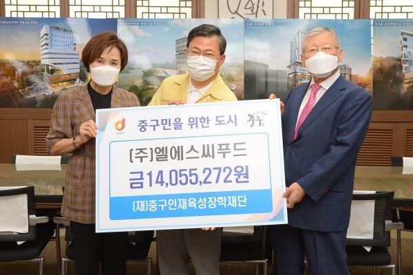 [무한뉴스] 중구가 지난 23일 중구청 3층 구청장실에서 ㈜엘에스씨푸드가 중구인재육성장학재단에 후원금 1천4백여만원을 기탁했다고 전했다.