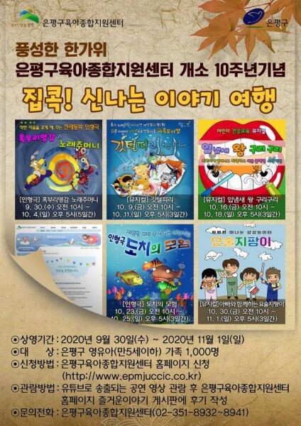 [무한뉴스] 은평구는 추석 명절과 육아종합지원센터 개소 10주년을 기념해 오는 9월 30일부터 11월 1일까지 온라인으로 ‘집콕 신나는 이야기 여행’ 영유아 가족 행사를 진행한다.