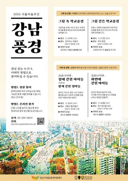 [무한뉴스] ‘기분 좋은 변화, 품격 있는 강남’을 실현 중인 강남구가 ‘2020 서울마을주간’을 맞아 24일부터 오는 28일까지 강남구 마을인문학 온라인 강연인 ‘강남풍경’을 4회에 걸쳐 진행한다.