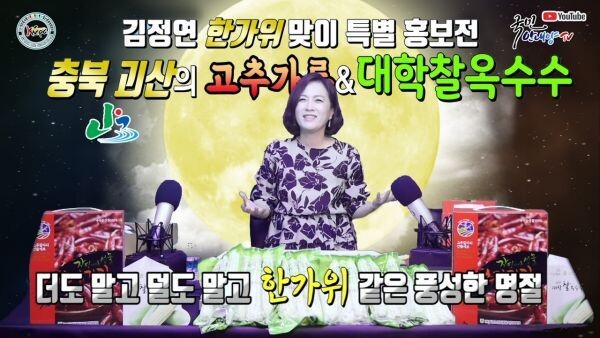 군은 어르신들의 BTS 가수 김정연 씨가 진행하는 국민안내양TV를 통해 냉동 대학찰옥수수와 괴산청결고추 홍보에 박차를 가하고 있다.