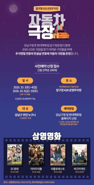 이번 무료 자동차극장은 강남구와 현대백화점 공동 개최하는 것으로 사회적 거리두기로 이번 추석 연휴 기간 고향에 방문하지 않거나 코로나19 장기화로 문화·예술을 접할 기회가 적어진 구민들의 일상 속 힐링을 돕는다.