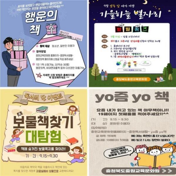 중원교육문화원 관계자는 “독서하기 좋은 계절에 책과 함께하는 소소한 즐거움을 만끽할 수 있도록 안전한 방식의 비대면 서비스와 다양한 온라인 독서문화 행사를 기획하게 됐다”고 말했다.