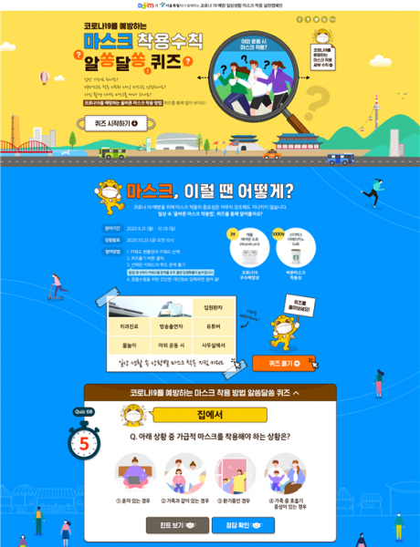 ‘야외운동’, ‘카페에서’, ‘면마스크’ 등 일상생활 속 상황별 마스크 착용 지침 키워드를 선택해 퀴즈를 풀면서 올바른 마스크 착용법을 알아볼 수 있도록 기획했다.
