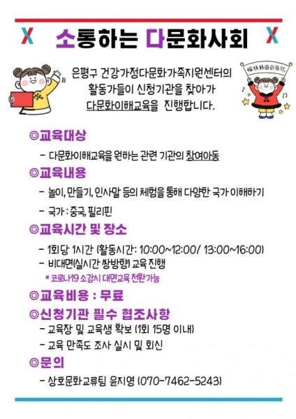 [무한뉴스] 은평구 건강가정·다문화가족지원센터에서는 결혼이주여성이 지역사회 공동체의 일원으로서 역량을 키울 수 있도록 지원하는 “소통하는 다문화사회” 프로그램을 실시한다.