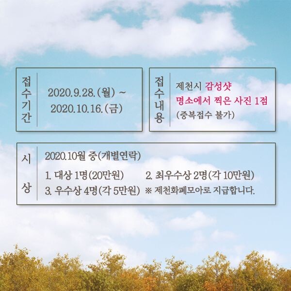 시 관계자는 “제천시는 수려한 경치를 자랑하는 곳이 많아 숨겨진 명소가 많을 것으로 생각된다”며 “시민들의 많은 참여로 알려지지 않은 감성 샷 명소가 많이 발굴되길 바란다”고 전했다.