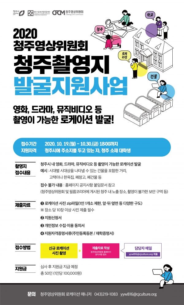 청주시 거주자 혹은 청주 소재 대학 재학생이라면 누구나 지원 가능하며 청주영상위 홈페이지에서 신청양식을 내려 받아 작성한 뒤 발굴한 촬영지 사진과 함께 이메일 yyw816@cjculture.org로 제출하면 된다.