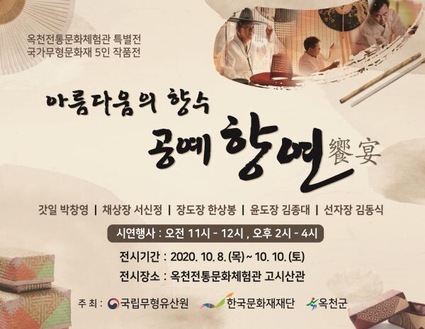 군에 따르면 이번 전시회는 국가무형문화재 5인의 공예 작품이‘아룸다움의 향수-공예 饗宴’이라는 주제로 10월 8일부터 10일까지 3일간 전통문화체험관 고시산관 대청마루에서 진행된다.