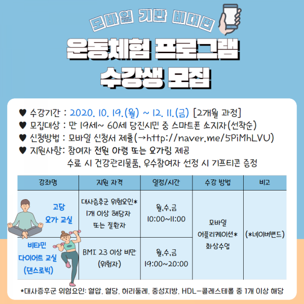 운동체험프로그램은 ‘고당 요가 교실’, ‘비타민 다이어트 교실’ 2개의 강좌이며 운영방법은 모바일 어플리케이션을 통해 화상수업으로 진행되고 예약제로 사전·사후 검사 및 개별 상담을 실시한다.