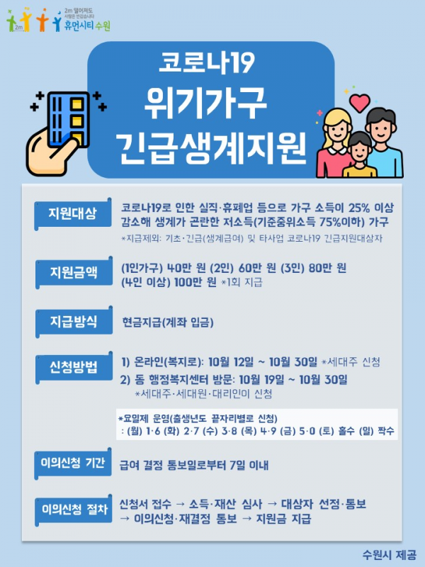 증빙서류를 첨부해 신청하면 수원시가 지원 대상 여부를 결정한 후 신청 계좌로 지급한다.