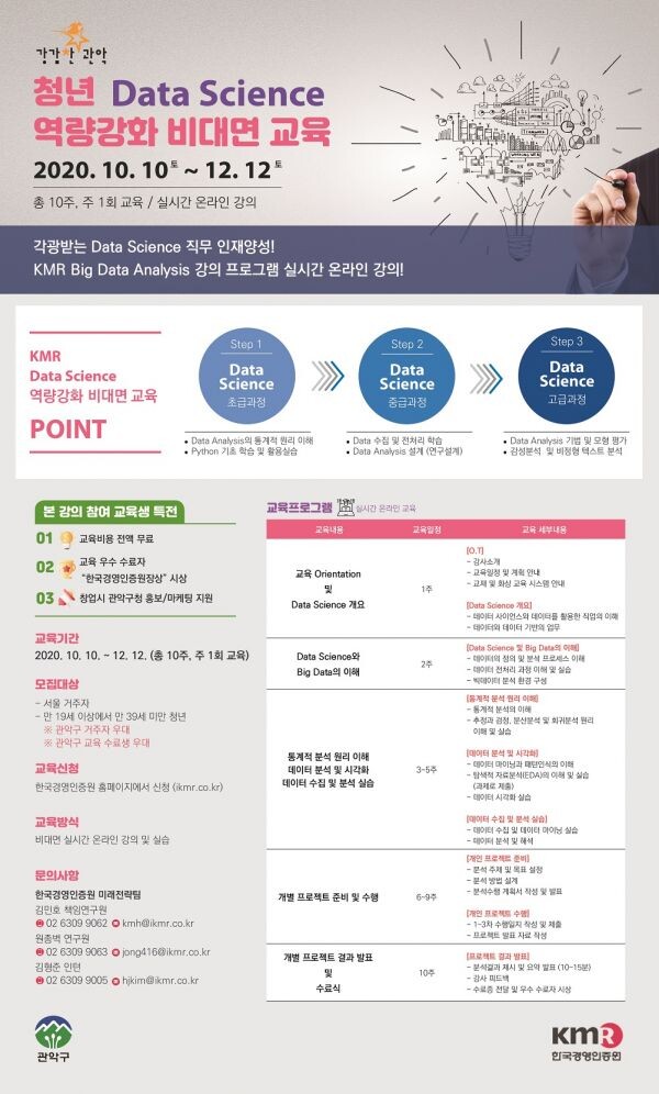 박준희 구청장은 “4차 산업시대를 살아가는 청년들의 지속적인 성장과 경쟁력 제고를 위해 준비했다”며 “이번 교육이 빅데이터 분야로의 취·창업을 희망하는 청년들에게 많은 도움이 되길 바란다”고 말했다.