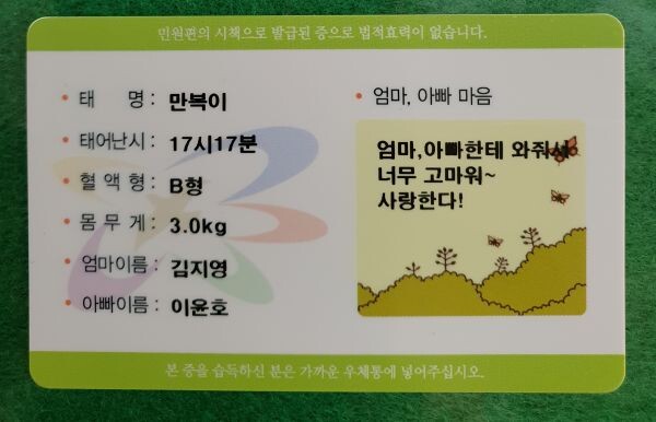 앞면에는 사진, 주소, 뒷면에는 태명, 태어난 시, 몸무게, 혈액형, 아이에게 바라는 말 등을 담는다.