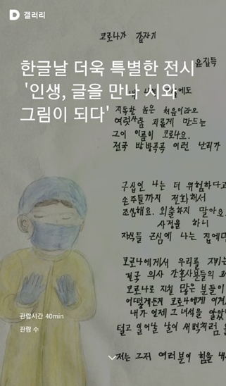 한글날 기념 ‘서울 문해교육 온라인 시화 전시회’는 10.8 10:00~오후 6시, 10.9 오후 6시 ~ 10.10 10:00 2회에 거쳐 카카오 갤러리를 통해 개최하며 ‘다음 모바일 뉴스탭’과 ‘카카오톡 #뉴스탭’에서 만날 수 있다.