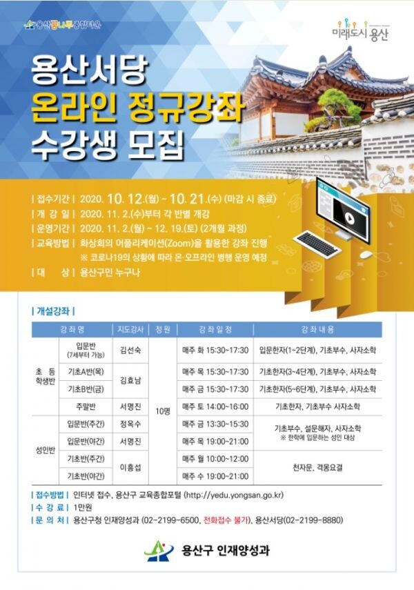 성장현 용산구청장은 “한자는 모든 학문의 기초”며 “다가오는 겨울, 용산서당 온라인 강좌로 문자향을 느껴보시기 바란다”고 말했다.