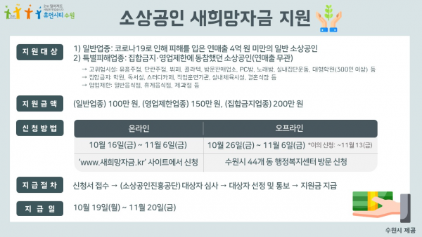 감염병 확산 예방을 위해 정부의 집합금지명령과 영업 제한에 동참했던 수원시 내 소상공인은 물론 올해 매출이 감소한 연 4억원 미만의 일반 소상공인이 100만~200만원의 긴급재난지원금을 받을 수 있다.