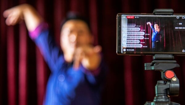 김영덕 스포츠댄스 강사가 스마트폰으로 수업을 실시간 중계한 것. 김 강사는 숙련된 자세를 취하면서 학생들에게 포인트를 일일이 짚어줬다.