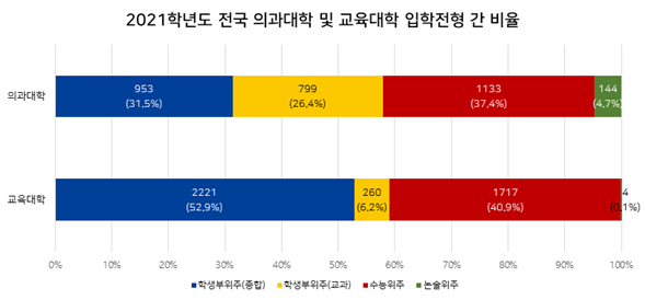 그 심각성은 유사한 전문직 양성 과정 중 하나인 교육대학의 입학전형과 비교할 때 더욱 선명하게 드러난다.