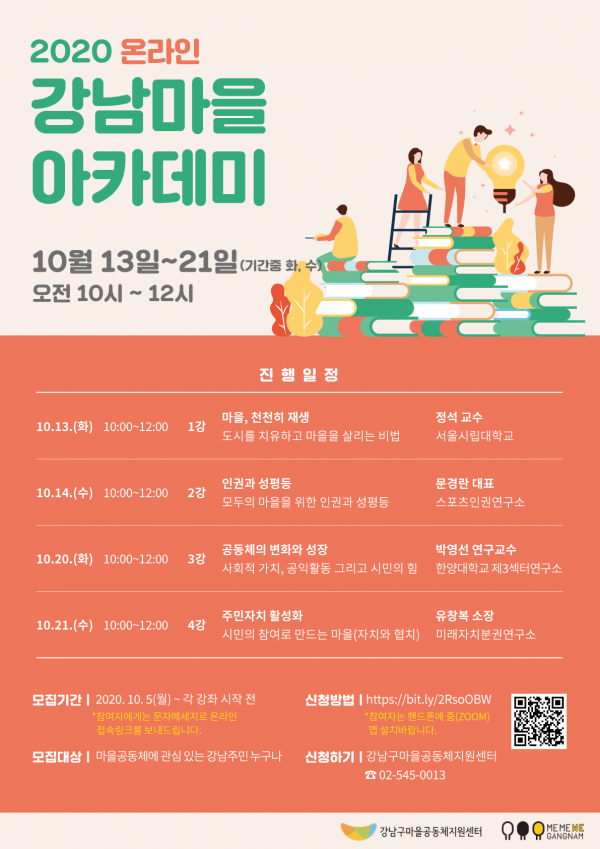 ‘2020 강남 마을아카데미’는 총4회에 걸쳐 진행되며 13일에는 정석 서울시립대 교수가 ‘마을, 천천히 재생: 도시를 치유하고 마을을 살리는 비법’을 주제로 이튿날 문경란 스포츠인권연구소 대표가 ‘인권과 성평등: 모두의 마을을 위한 인권과 성평등’에 대한 강연을 이어간다.