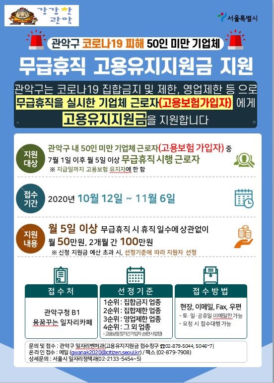 지원대상은 관악구 소재 50인 미만 기업체에 근무하며 고용보험에 가입된 근로자 중 7월 1일 이후 월 5일 이상 무급휴직을 실시한 근로자이며 지원인원은 업체당 최대 49명까지 가능하고 월 50만원을 최대 2개월 간 지급한다.