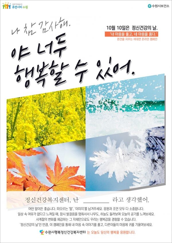 수원시보건소 관계자는 “코로나19 장기화로 많은 시민이 공포와 불안, 스트레스, 우울을 느끼고 있다”며 “이번 온라인 캠페인을 통해 시민들이 정신건강에 대한 편견을 없애고 심적으로 어려움을 겪는 분은 상담 등으로 도움을 받길 바란다”고 말했다.