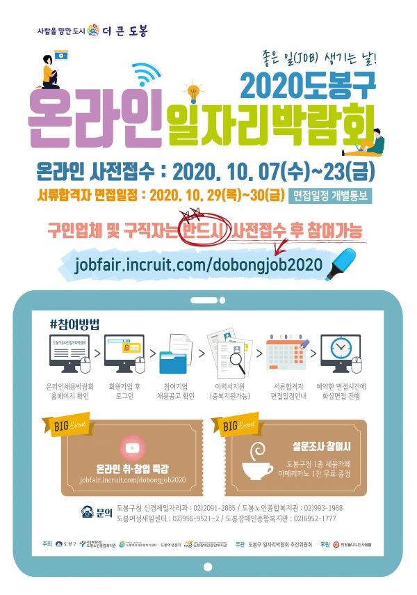 구직자는 누구나 박람회 기간 중 전용 홈페이지를 통해 참가할 수 있으며 온라인 활용이 상대적으로 어려운 중장년 구직자는 도봉구 일자리 플러스 센터로 방문 신청하면 된다.
