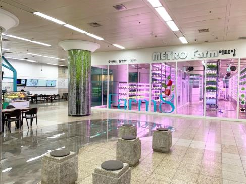 메트로팜은 지하철 역사 공간 내에 설치되어 첨단 정보통신기술과 농업 기술을 접목해 청정채소를 재배하는 친환경 농장이다.