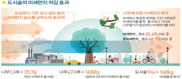 국립산림과학원 연구에 따르면, 1ha의 숲은 연간 168kg의 미세먼지 등 대기오염물질을 흡수하는 효과가 있다.
