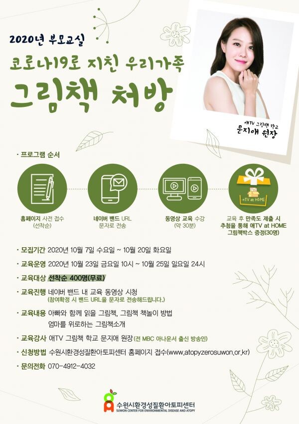 수원시환경성질환아토피센터 관계자는 “그림책 읽기는 부모와 아이를 이어주고 즐겁게 해주는 매개체 역할을 한다”며 “이번 교육이 코로나19로 지친 영유아 가정에 조금이나마 위로가 되길 바란다”고 말했다.