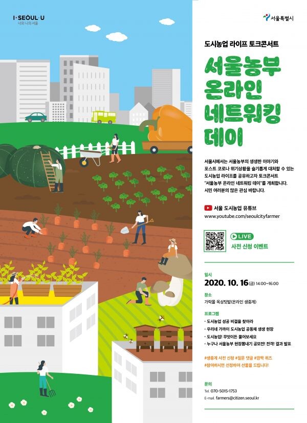 서울시는 코로나19상황 속에서도 도시농업 활동을 성공적으로 이끌어가고 있는 단체의 우수사례를 나누고 유튜브 댓글을 통해 도시농업에 대한 질의&응답시간을 진행하는 ‘서울농부 온라인 네트워킹 데이’가 10월 16일 오후 2시부터 ‘서울 도시농업’ 유튜브 채널을 통해 생중계된다고 밝혔다.