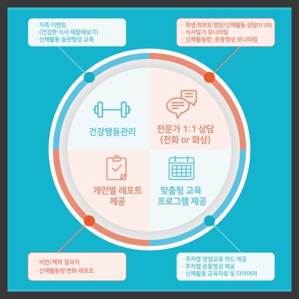 참여자의 식습관을 파악한 후 맞춤 목표 설정과 영양 상담, 건강 정보를 제공하며 신체활동 모니터링 후 상담, 운동 영상, 활동량 변화 피드백 등을 통해 가족의 라이프 스타일에 맞춰 올바른 생활습관을 형성하고 건강을 개선하도록 돕는다.